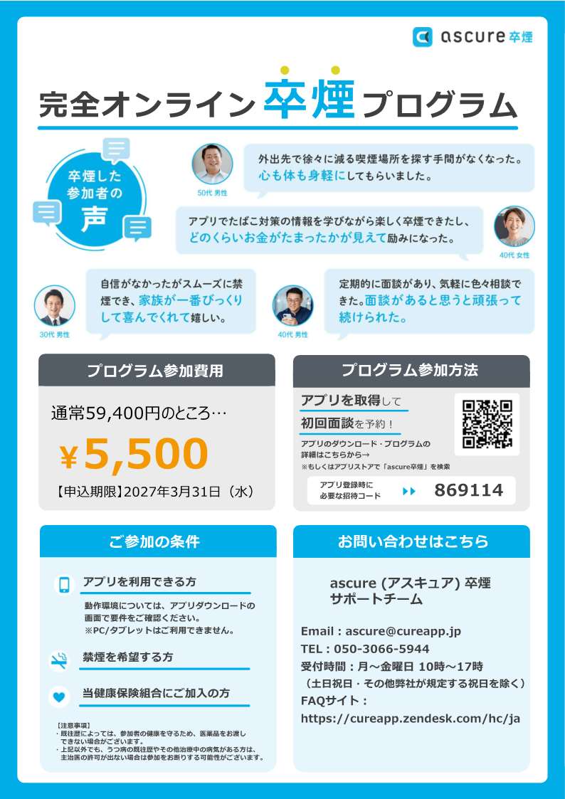 「ascure卒煙」(スマホアプリ)を用意しました。対象OSの制限あり。
